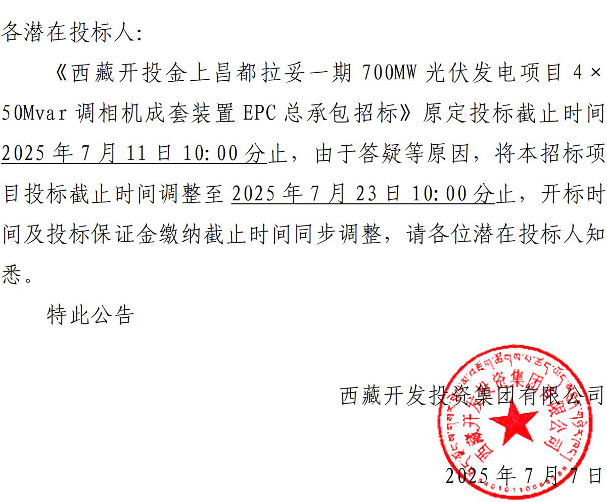 關(guān)于延長《西藏開投金上昌都拉妥一期700MW光伏發(fā)電項目4×50Mvar調(diào)相機(jī)成套裝置EPC總承包招標(biāo)》投標(biāo)截止時間的公告